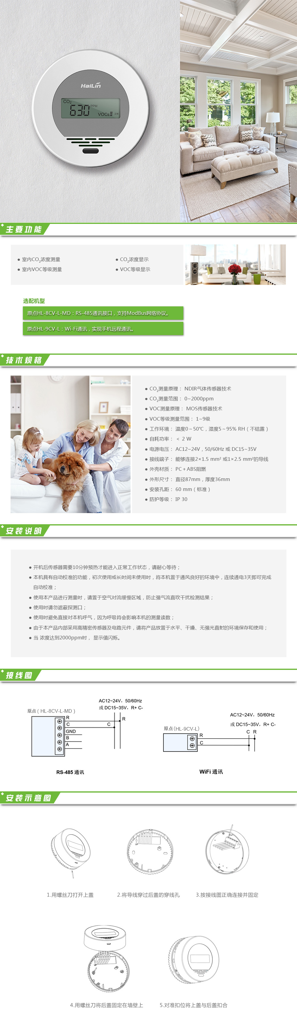 海林“原點”CO2-VOC監測傳感器是一款實時空氣質量檢測儀,CO2傳感器監測采用國際先進的NDIR氣體傳感器技術,VOC傳感器結合最先進的MOS傳感器技術與智能檢測算法監測揮發性有機化合物,由微處理器對檢測數據進行運算并將計算結果與污染等級同時顯示在液晶上。