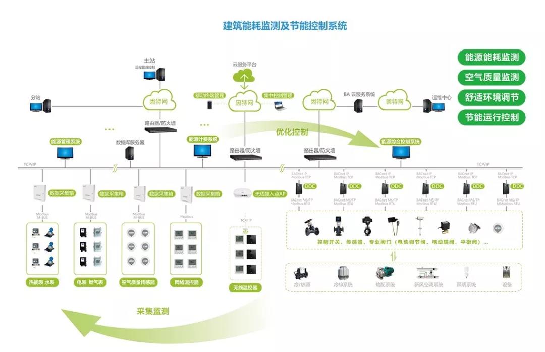 通過云平臺將能耗監測系統和節能控制系統互聯,通過各種傳感器和監測軟件,實現對建筑內各個環節各個區域的數據監測,并對采集到的數據進行運算、優化,再把優化以后的數據運用到控制模塊,如機房的機主、管道系統的水泵、閥門,室內的溫度、濕度、空氣質量控制器等,有效調控這些設備的工作狀態,最終實現整個建筑的舒適、健康和節能。