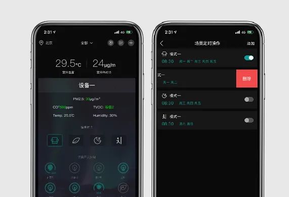 通過手機(jī)App,可以實(shí)現(xiàn)一鍵集中控制全屋的情景模式:一鍵全屋舒適、全屋節(jié)能等模式。也可以實(shí)現(xiàn)一鍵關(guān)空調(diào)、一鍵關(guān)燈等具體設(shè)備的具體控制。