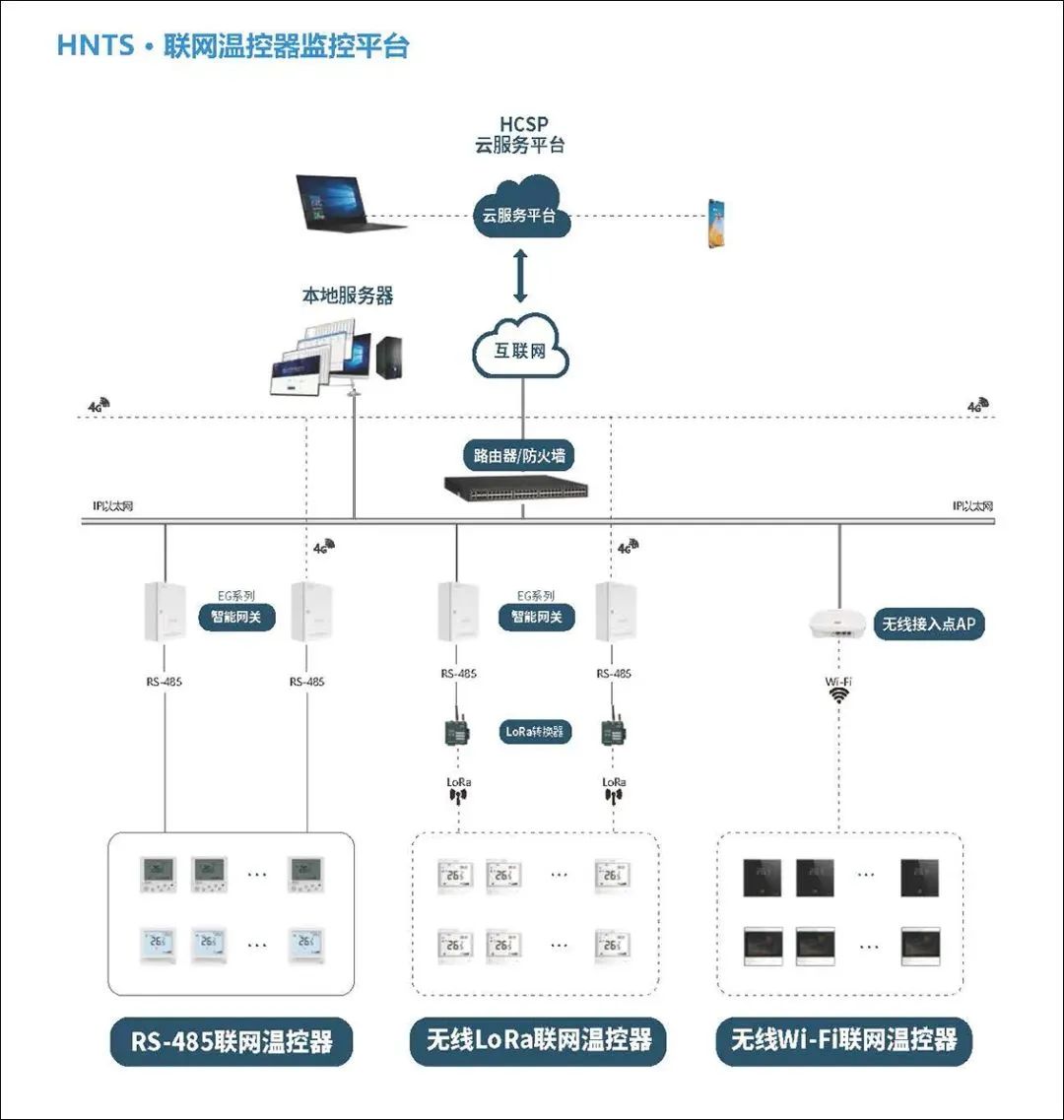海林HNTS末端溫控器集控系統(tǒng)集自動(dòng)化控制技術(shù)、計(jì)算機(jī)網(wǎng)絡(luò)技術(shù)于一體,可同時(shí)集中或獨(dú)立對多臺末端設(shè)備的啟停、水閥的開閉及溫度設(shè)置進(jìn)行控制。有三種聯(lián)網(wǎng)集控方式:RS-485 有線方式、 LoRa 無線方式和 Wi-Fi 無線方式。
