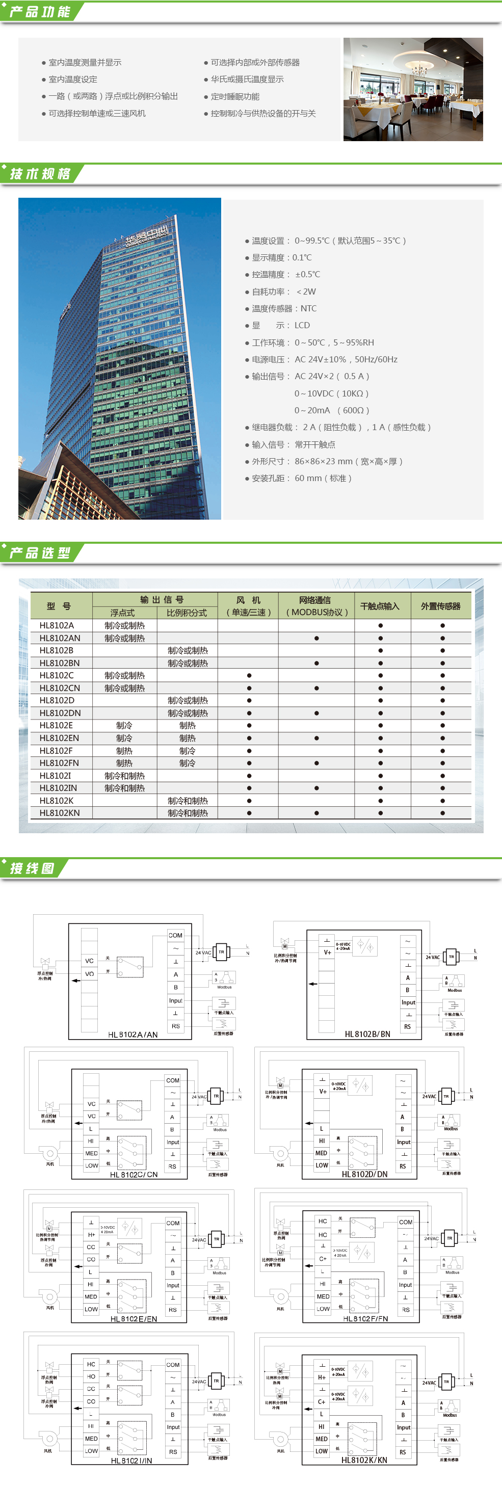 比例積分型溫控器HL8102用于家庭、辦公樓、寫字樓、學校等場所的溫度控制,適用于控制信號為DC 0-10V(或0-20 mA)及浮點控制的電動調(diào)節(jié)閥及變風量系統(tǒng)中的風門執(zhí)行器,并能選擇控制單速或三速風機,具有網(wǎng)絡(luò)控制功能(N型,MODBUS協(xié)議)。