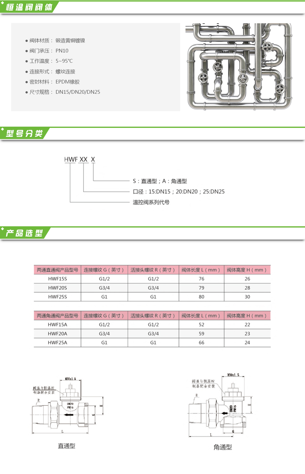恒溫閥HWF是安裝在散熱器上的自動控制閥門。與控制器T36配套使用能夠自動感知環境溫度,并在不通過外力的情況下進一步調節閥開度,控制水流的大小,進而維持房間溫度在設定溫度。海林溫控閥嚴格按照歐盟標準EN215進行生產,設計精巧,控溫精確,可滿足各種管網結構的應用。 還可與電熱執行器T51配套使用。