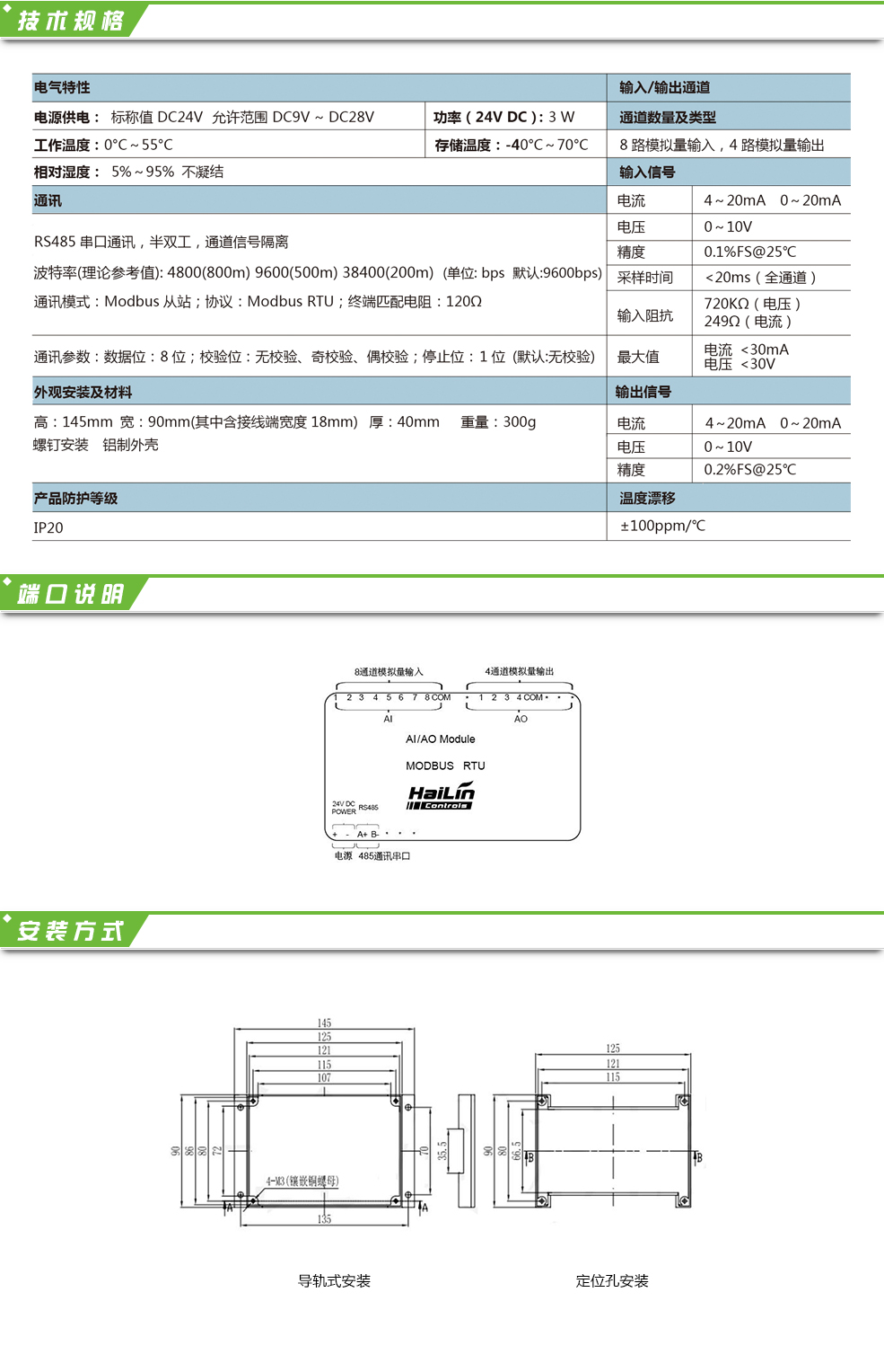 I/O擴展模塊HL-M02/HL-M03/HL-M04是一款可通過RS485接口與遠程主機或者樓宇控制器通訊的設(shè)備;該產(chǎn)品具有8路電壓0~10V或0~20mA或4~20mA模塊量輸入、4路0~10V或0~20mA或4~20mA模擬量輸出。該控制器具有1路485通訊串口,可實現(xiàn)與MODBUS設(shè)備通訊。應(yīng)用于樓宇自控系統(tǒng)中與樓宇控制器配套使用。